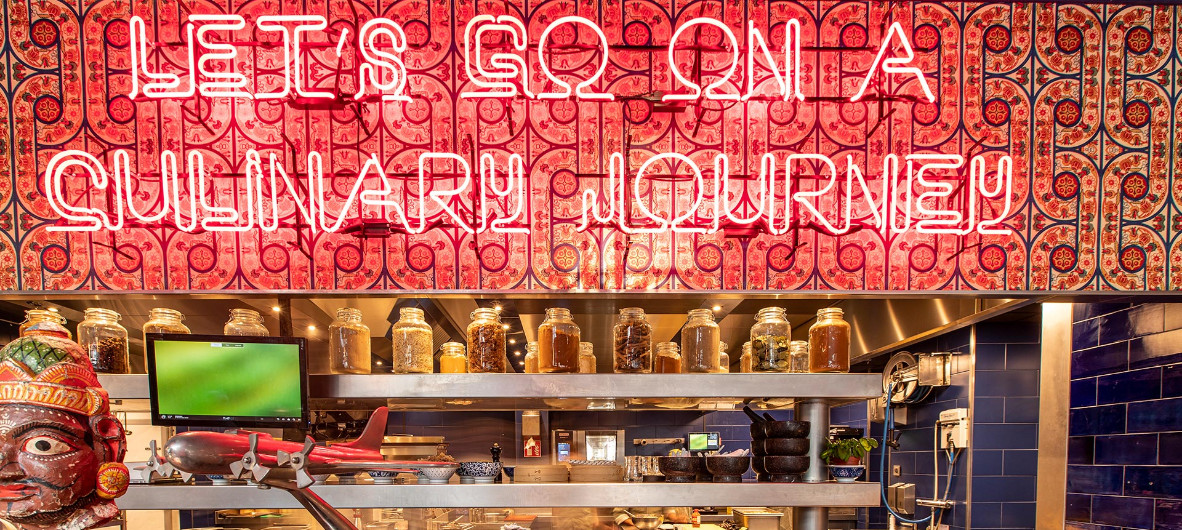 Deenik flew around the world, collecting the most exciting flavours from a diversity of cuisines in the meantime. Deenik recounts: ‘I have been travelling almost all my life and always took recipes from everywhere. From Asia, South America, Africa... They are happy areas, with even-keeled markets, colourful people and spices. I wanted to convey that melting pot of flavours and cultures. For example, in the interior, where souvenirs play a big role, but also in the kitchen.’ All the physical and mental baggage has been forged together into a large, colourful restaurant serving worldly dishes, traditional but with a modern twist. The Traveller.